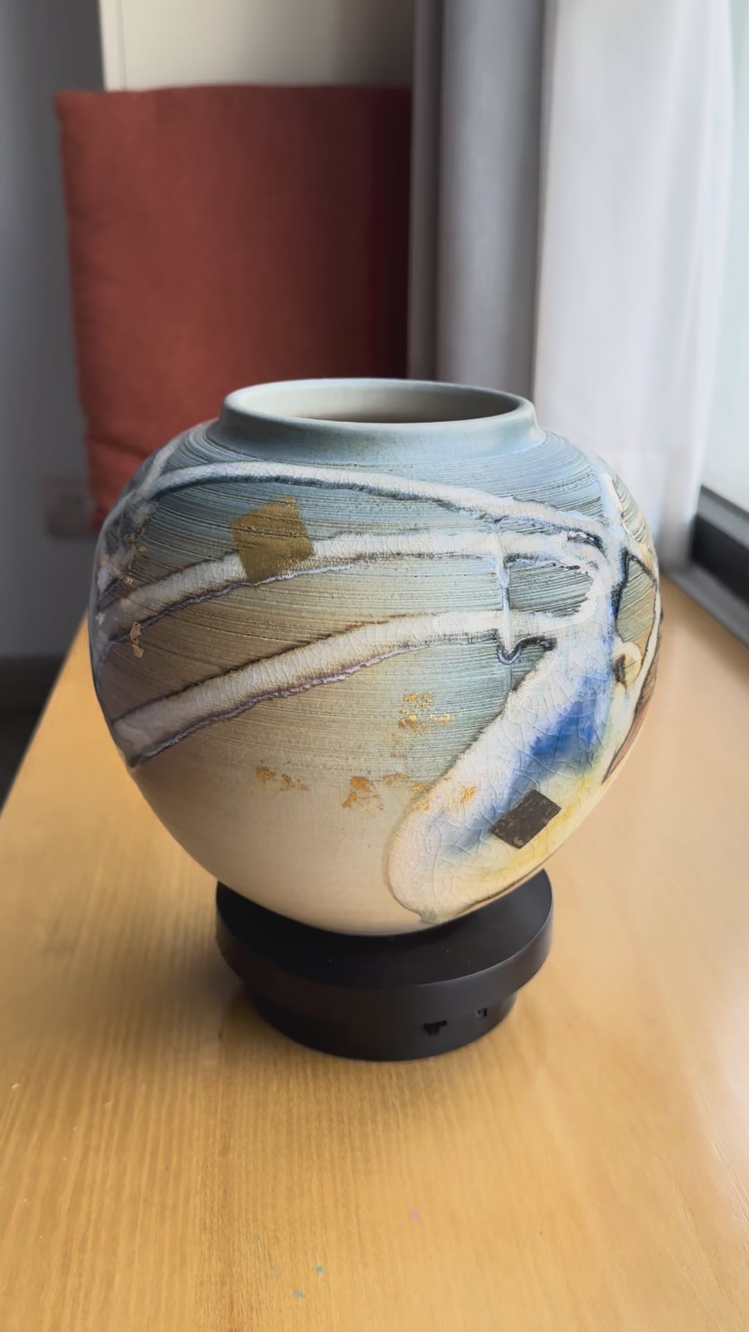 The surface features a warm desert-gold glaze reminiscent of sunlit riverbanks, merging seamlessly with flowing streaks of ocean blue that evoke moving water and the gentle rhythm of the Kamo’s seasonal tides. Textural white trails cascade across the form like ripples collapsing into one another, while delicate squares of gold leaf shimmer across the surface, adding a refined sense of luxury and movement.